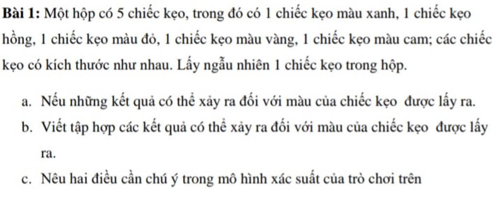 a) Có 5 kết quả có thể xảy ra đối vs màu của chiếc kẹo được lấy ra là : Chiếc kẹo màu xanh , chiếc kẹo màu hồng, chiếc kẹo màu đỏ, chiếc kẹo màu vàng, chiếc kẹo màu cam.