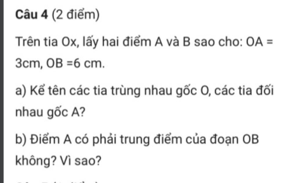 Giải thích các bước giải: kẻ tia ox đánh dấu điểm a và b trên tia sao cho oa = 3cm và ob=6cm