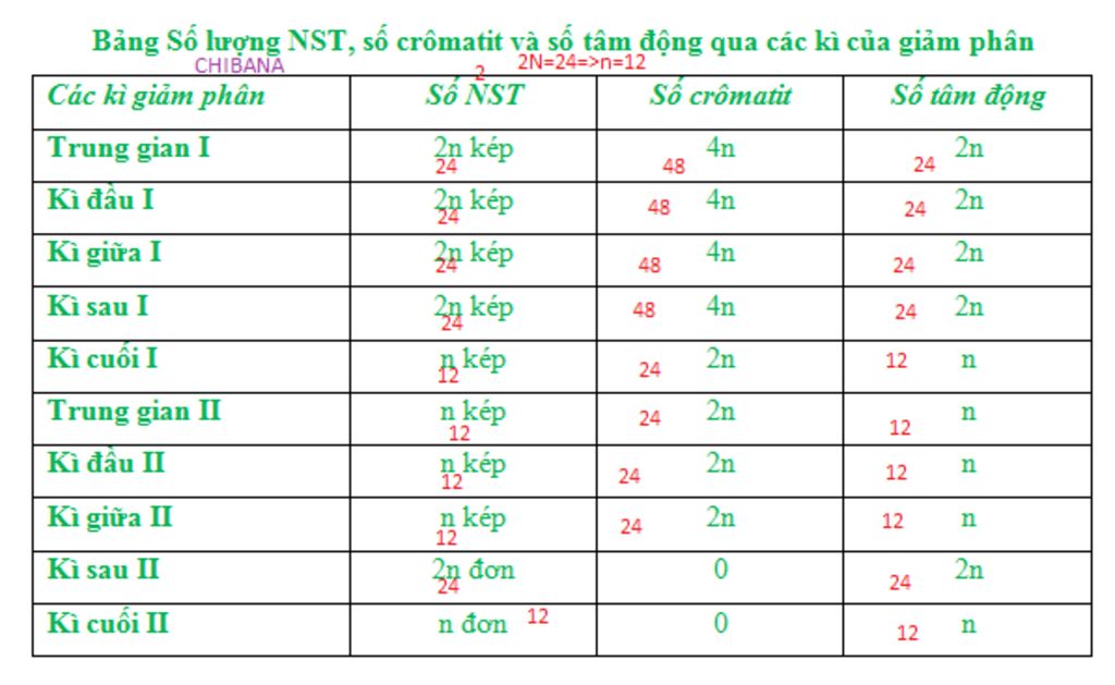 Số NST đơn, kép, số cromatit tại các kì của giảm phân chứ không phải nguyên phân ạ
