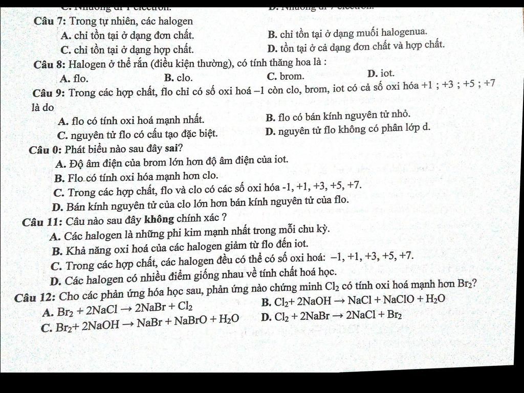 $\text{Câu 9 : Trong các hợp chất, flo chỉ có số oxi hoá -1 còn clo, brom, iod có cả số oxi hóa +1; +3; +5; +7 là do }$