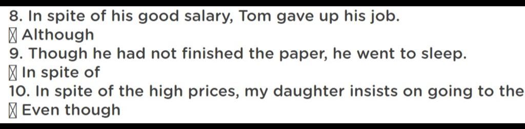 `-` Cấu trúc: In spite of + Noun (Phrase) /Ving + S + V