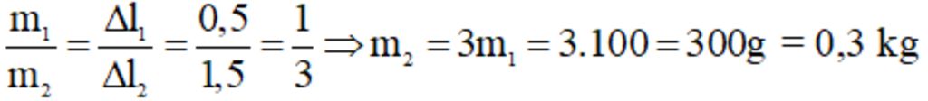 \(\dfrac{{{m_1}}}{{{m_2}}} = \dfrac{{\Delta {l_1}}}{{\Delta {l_2}}} \Rightarrow \dfrac{{100}}{{{m_2}}} = \dfrac{{0,5}}{{1,5}} \Rightarrow {m_2} = 300g\)