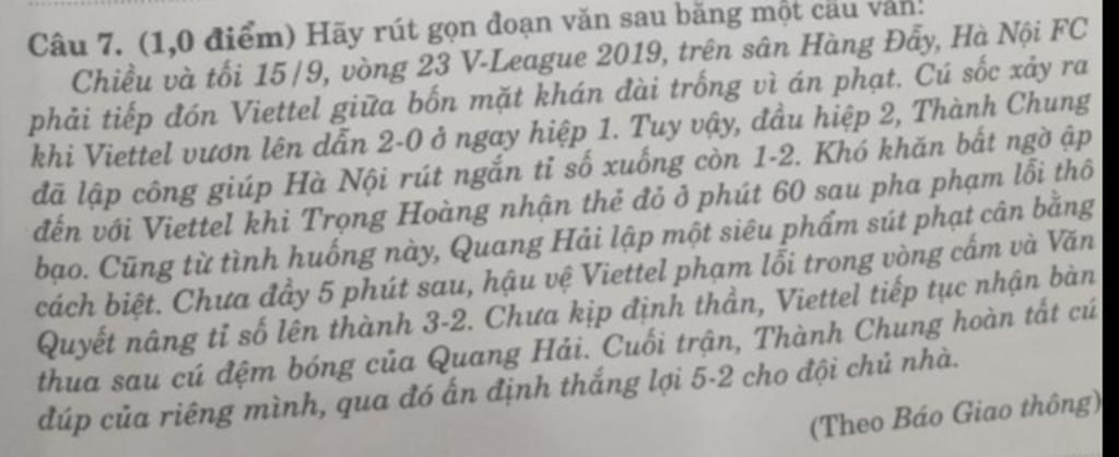 - Rút gọn : Chiều tối ngày 15/9 , có một trận đấu V.League ở giữa Hà Nội FC và Viettel trên sân Hàng Đẫy với những phút giây hồi hộp , gây cấn , những pha bóng điêu luyện cùng sự kiên cường , Hà Nội FC đã giành chiến thắng 5 - 2 chung cuộc .