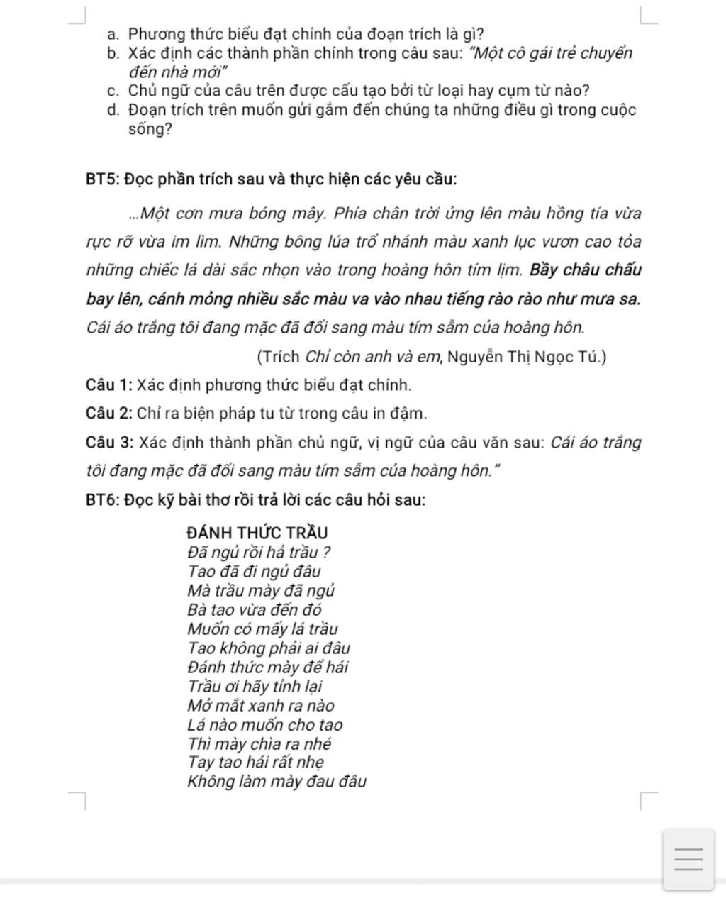 Câu 3: Xác định thành phần chủ ngữ, vị ngữ của câu văn sau: Cái áo trắng tôi đang mặc đã đổi sang màu tím sẫm của hoàng hôn.”
