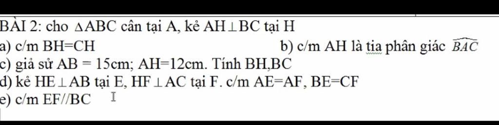 a) Vì `AH⊥BC→AH` là đường cao của `ΔABC`