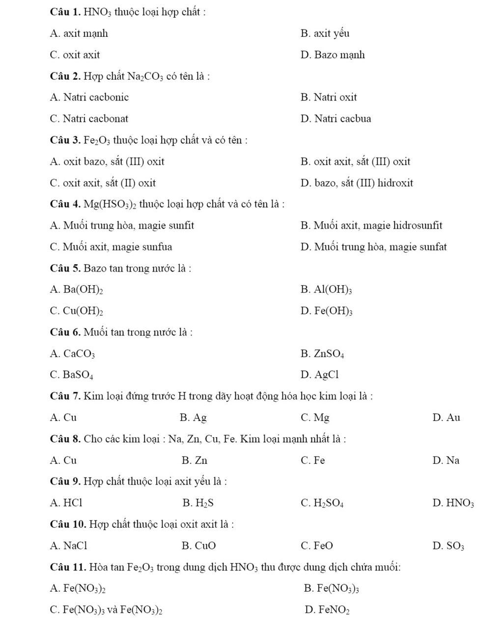 Câu `9:` Chọn `B` vì `HCl`, `H_2SO_4`, `HNO_3` là hợp chất thuộc axit mạnh