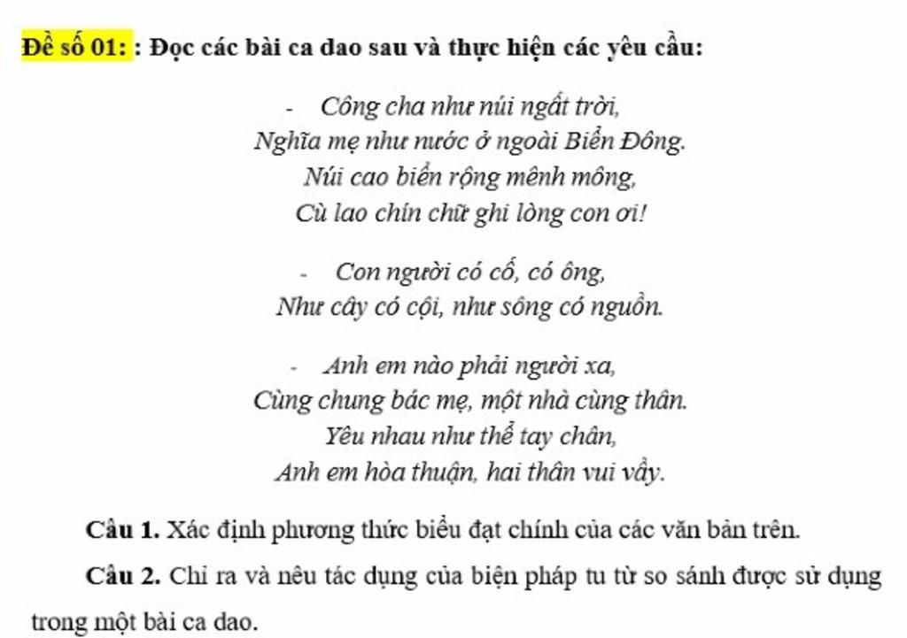 $-$ Biện pháp tu từ : So sánh ( Công cha như núi ngất trời , Nghĩa mẹ như nước ở ngoài biển Đông )