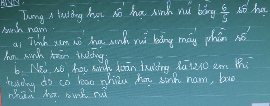a, Ta có: Vì số học sinh nữ bằng 6/5 số hoạc sinh nam nên số học sinh nam sẽ là 5/6 số học sinh nữ.