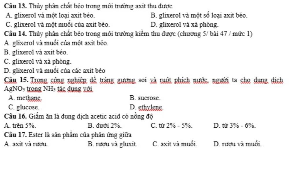 Khi thủy phân chất béo trong môi trường bazo ta được glixerol và muối của các axit béo