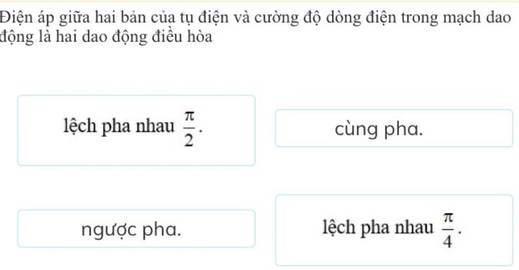 Điện áp giữa 2 bản tụ điện và cường độ dòng điện trong mạch dao động là hai dao động điều hoà lệch pha nhau $\pi /2$