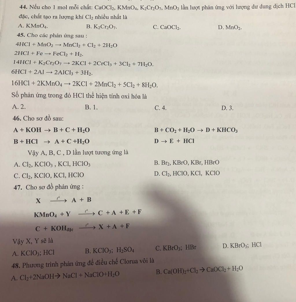 44. Nếu cho 1 mol mỗi chất: CaOCl2, KMNO4, K2Cr,O7, MnO2 lần lượt phản ứng với lượng dư dung dịch HCI
