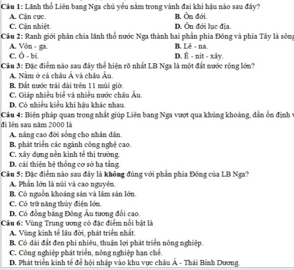 2:Địa hình Liên Bang Nga cao ở phía đông, thấp dần về phía Tây. Dòng sông Ê-nit-xây chia Liên bang Nga thành 2 phần rõ rệt: phần phía Tây và phần phía Đông (sgk trang 62)
