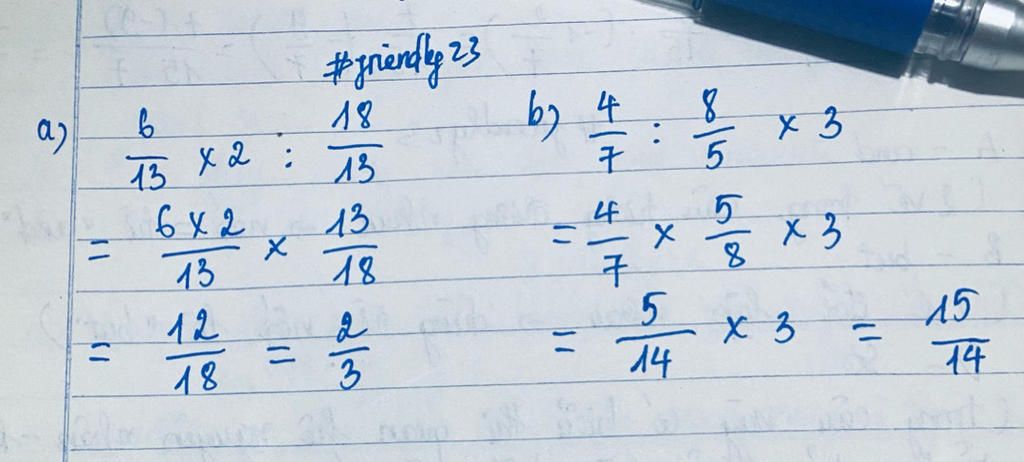 `a)` $\dfrac{6}{13}$ `×` `2` `÷` $\dfrac{18}{13}$