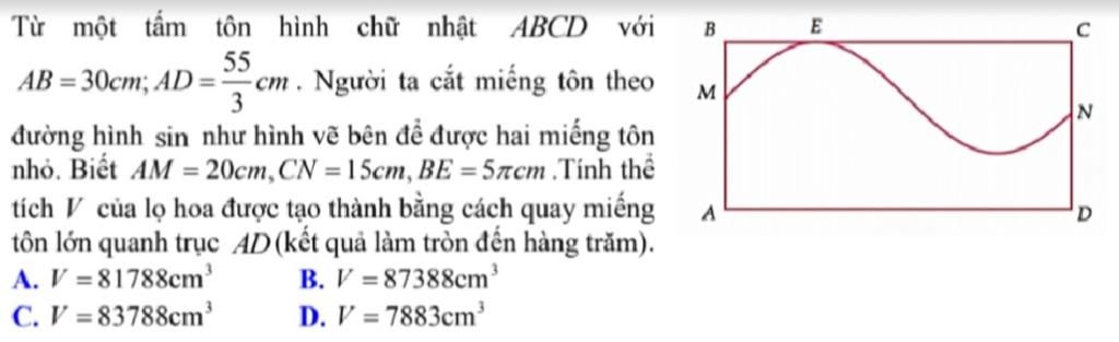 Nhận xét: Thể tích hình luôn nhỏ hơn thể tích hình trụ có đáy $AB=30,$ chiều cao $AD=\dfrac{55}3$ là:
