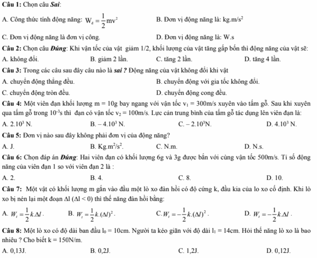 Câu 1:B Sai vì ta có đơn vị của công bằng đơn vị của động năng: