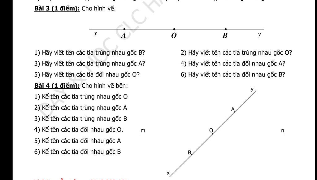 1) Các tia trùng nhau gốc O là: Om, On, Ox, Oy, OA, OB
