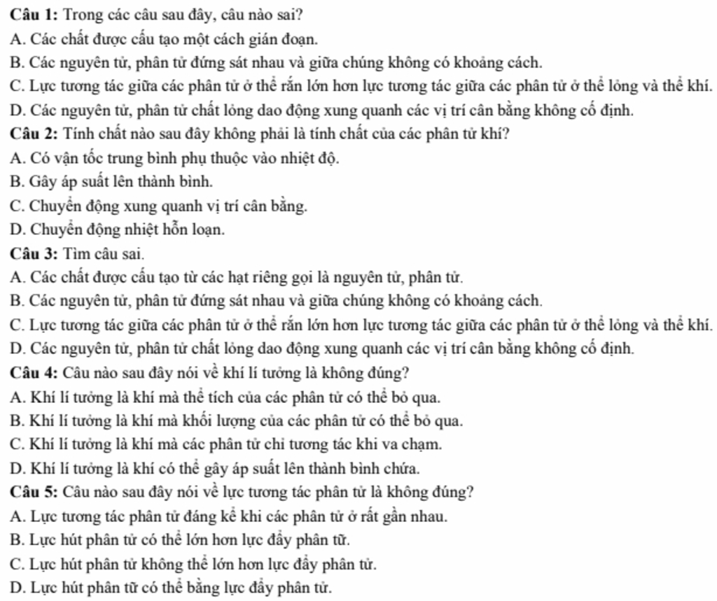 Câu 1:B. Sai vì các nguyên tửu phân tử luôn có khoảng cách.