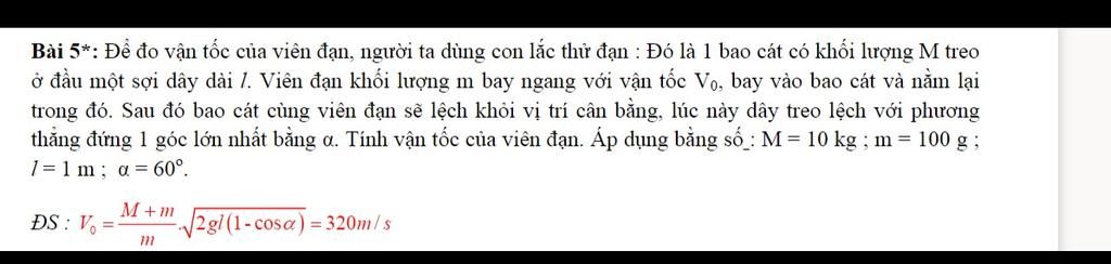 +Thế $V'$ vào $Vo=\frac{M+m}{m}.V'$ ta tính được vận tốc đạn là: