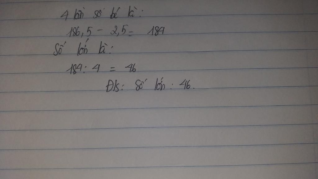 Hiệu hai số là 2 .5 . Nếu ta gấp số lớn lên 5 lần và giữ nguyên số bé thì ra được hai số có hiệu là186.5 . Tìm số lớn