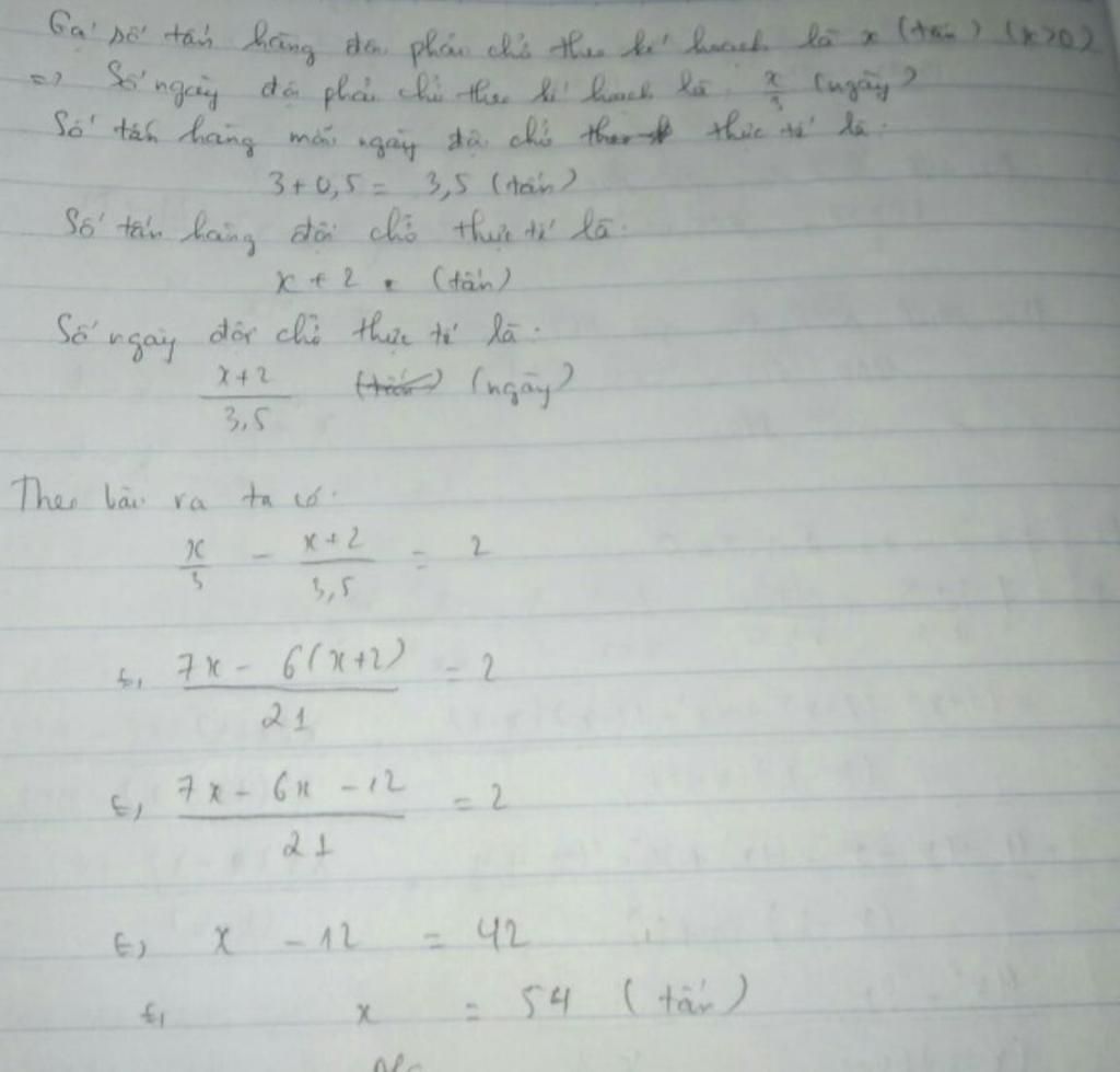 Thực tế thời gian mà đội xe tải đó phải chở số tấn hàng là : `(x+2)/(3,5)` (ngày)