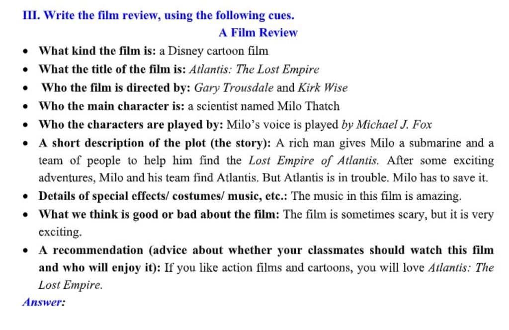 Có rất nhiều bộ phim tuyệt vời, nhưng tôi yêu thích nhất là Atlantis: The Lost Empire First, loại phim là phim hoạt hình Disney. Tựa phim trùng với tên phim là Atlantis: The Lost Empire. Bộ phim này do Gary Trousdale và Kirk Wise làm đạo diễn. Futhermore, nhân vật chính là một nhà khoa học. Tên anh ấy là Milo Thacth. Các nhân vật được đảm nhận bởi giọng nói của Milo do Michael J.Fox đảm nhận. Câu chuyện này nói về: Một người đàn ông giàu có đưa cho Milo một chiếc tàu ngầm và một nhóm người để giúp anh ta tìm ra Đế chế đã mất của Atlantis. Sau một số cuộc phiêu lưu thú vị, Milo và nhóm của mình tìm thấy Atlantis. Nhưng Atlantis đang gặp rắc rối. Milo phải cứu nó. Hơn nữa, các chi tiết về hiệu ứng đặc biệt, trang phục, âm nhạc,… đều được chuẩn bị kỹ lưỡng và chu đáo. Tôi nghĩ rằng bộ phim đôi khi hơi đáng sợ, nhưng nó rất thú vị và hấp dẫn. Nếu bạn thích phim hành động và phim hoạt hình, bạn sẽ thích Atlantis: The Lost Empire.