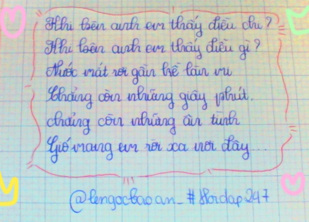 Xin 5* và ctlhn! $#Miu$ Hand: Khi bên anh em thấy điều chi? Khi bên anh em thấy điều gì? Nước mắt rơi gần kề làn mi Chẳng còn những giây phút, chẳng còn những ân tình Gió mang em rời xa nơi đây...