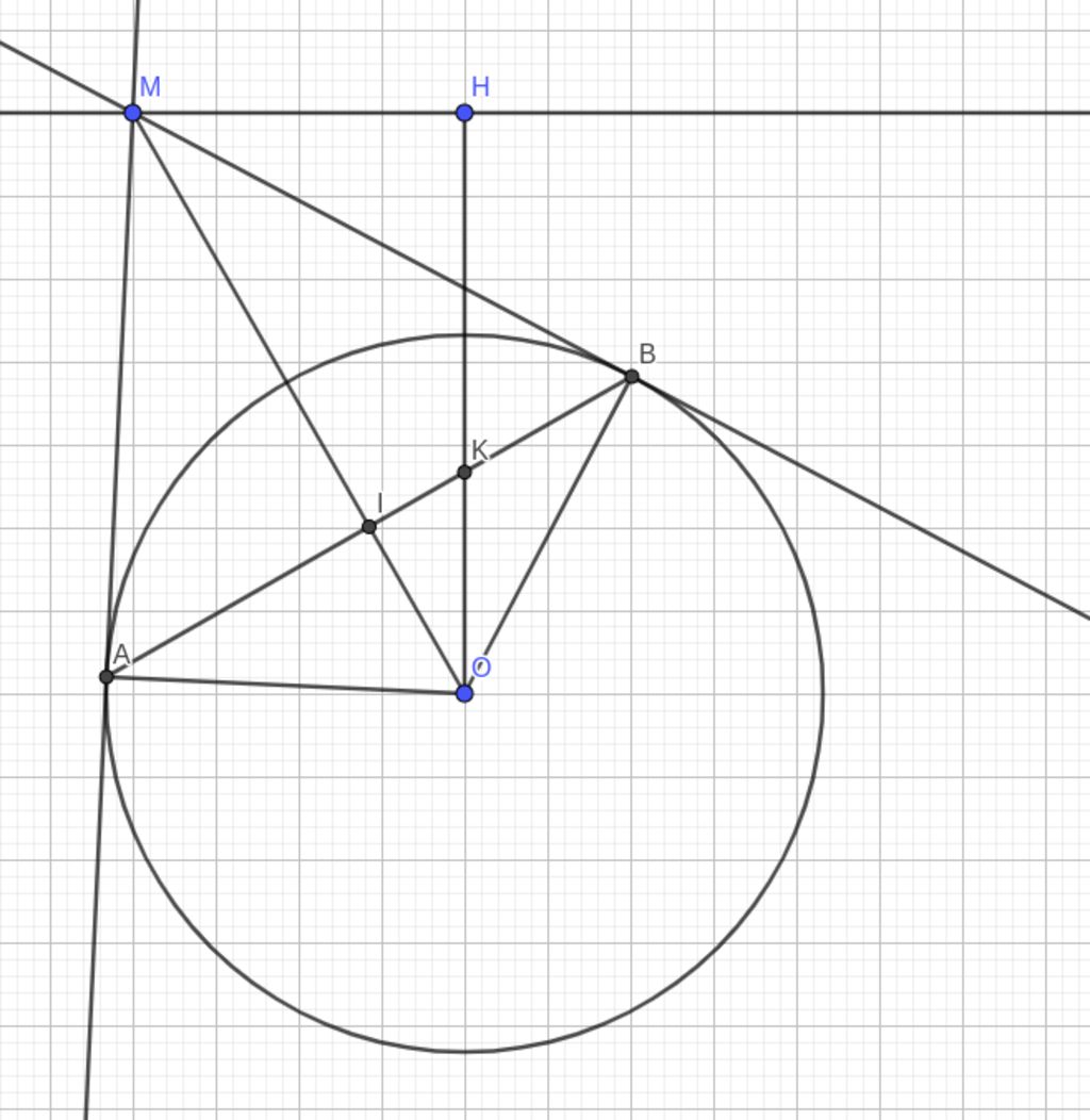 b.Do $MA, MB$ là tiếp tuyến của $(O)\to OM\perp AB=I$ là trung điểm $AB$