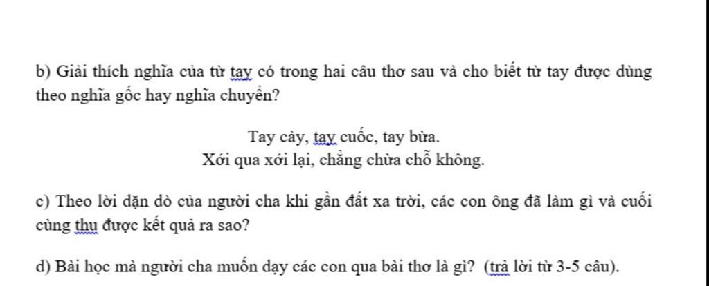 c. Theo lời dặn dò của cha khi gần đất xa trời, các con ông đã Lật tung đồng đây đó khắp nơi. và kết quả là Cuối năm lúa tốt bời bời bội thu.
