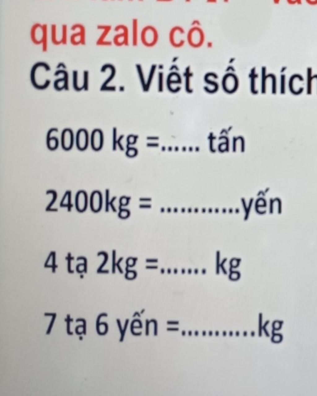 2400 kg = 240 yến giải thích : vì 1 yến = 10 kg nên 2400 kg = 240 yến