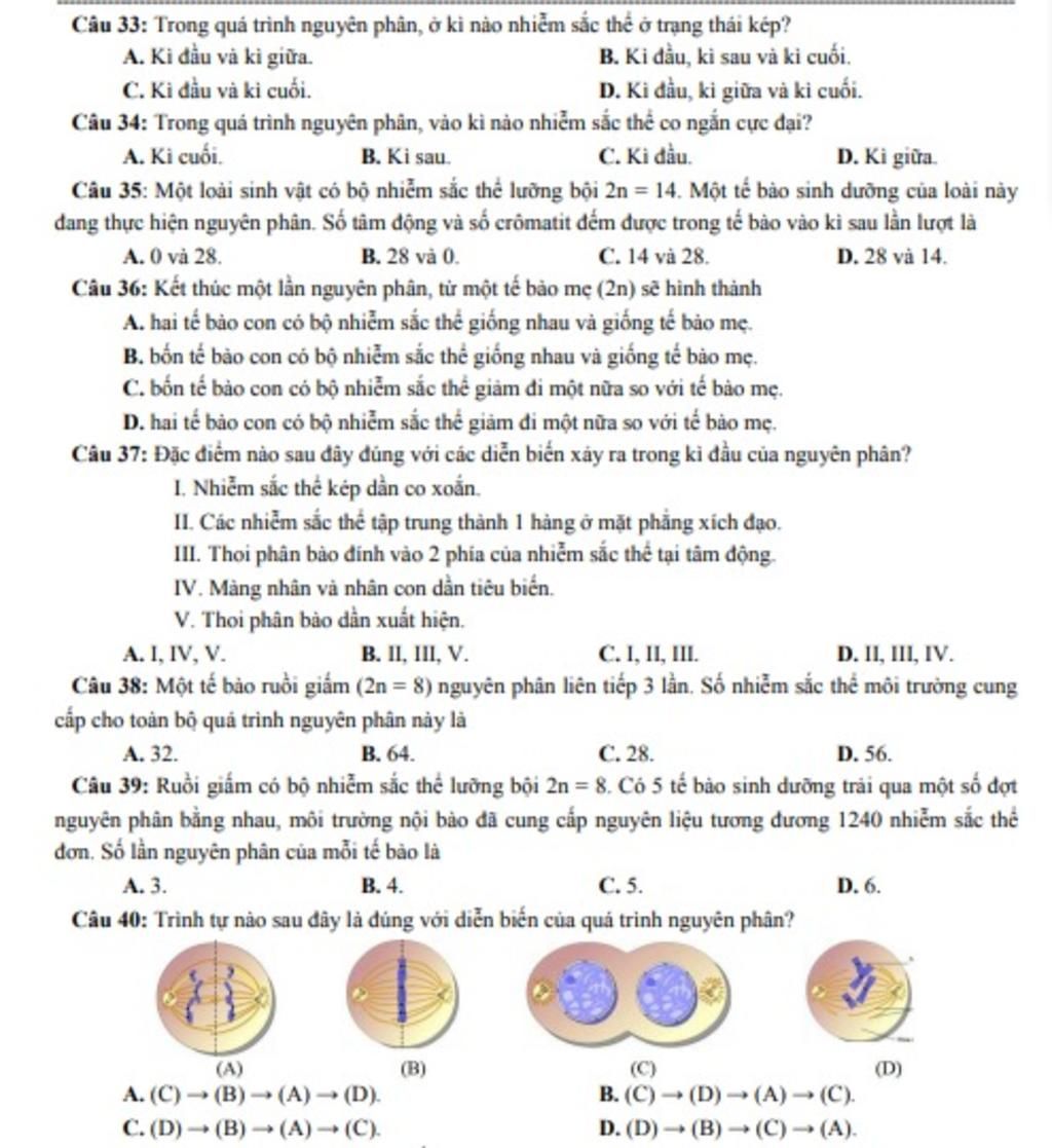 Trong quá trình nguyên phân NST ở trạng thái kép ở: kì đầu, kì giữa