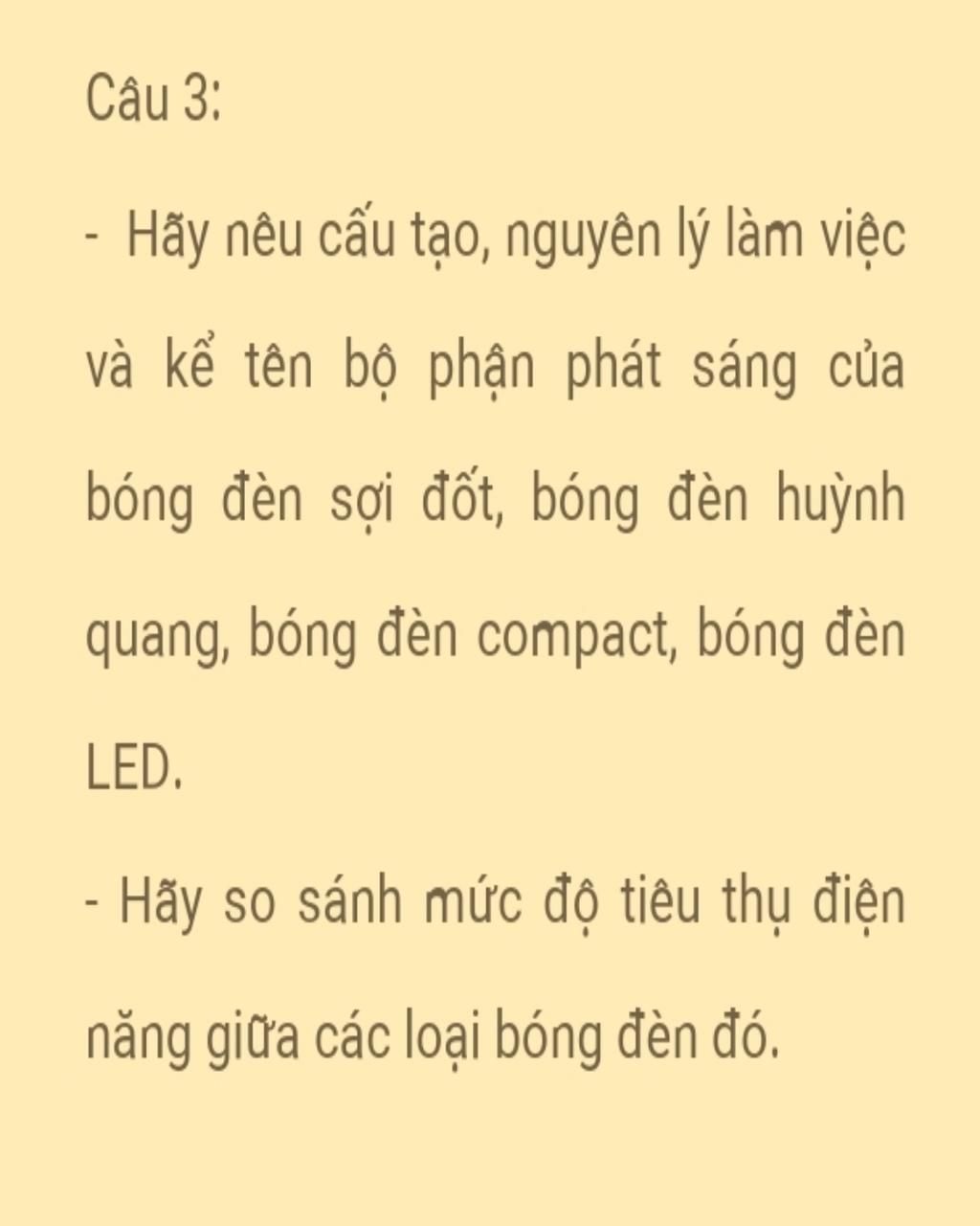 Hãy nêu cấu tạo, nguyên lý làm việc và kể tên bộ phận phát sáng của bóng đèn sợi đốt, bóng đèn huỳnh quang, bóng đèn compact, bóng đèn LED.