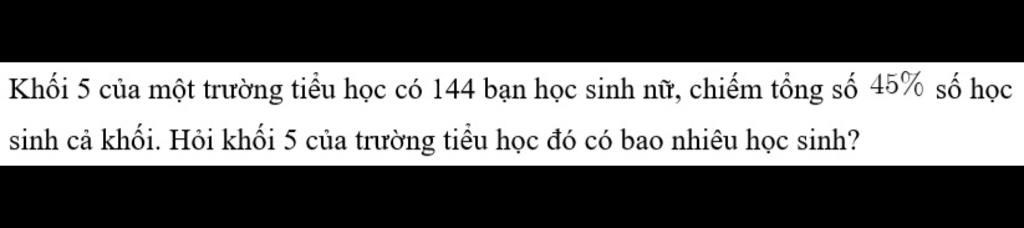 Khối 5có tất cả số học sinh là : 144:45×100 =320 ( học sinh ) Đáp số : 320học sinh