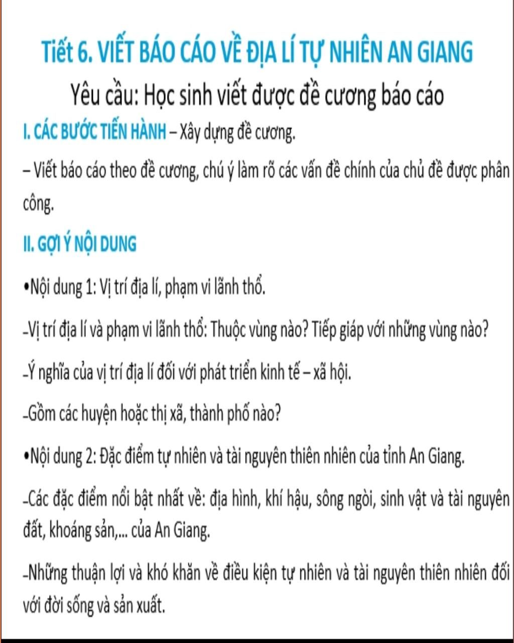 -Hiên nay quỹ đất của An Giang đã hết, cần đẩy mạnh thâm canh, tăng vụ, cải tạo đất phèn, quy hoạch đất chuyên dùng một cách hợp lí, mở rộng diện tích nuôi trồng thủy sản…