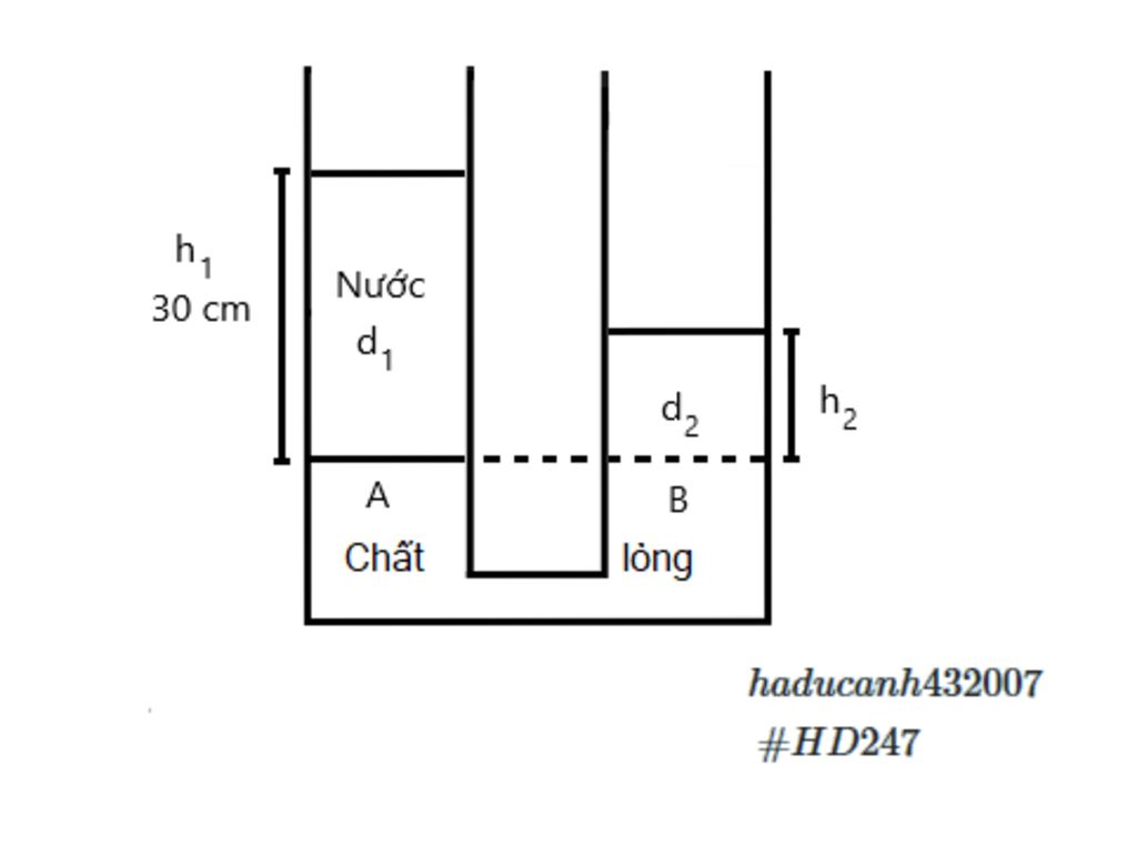 `A` là điểm nằm ở mặt phân cách giữa nước và chất lỏng có trọng lượng riêng `d_2`; `B` là điểm có cùng độ cao với điểm `A` nằm ở nhánh kia.