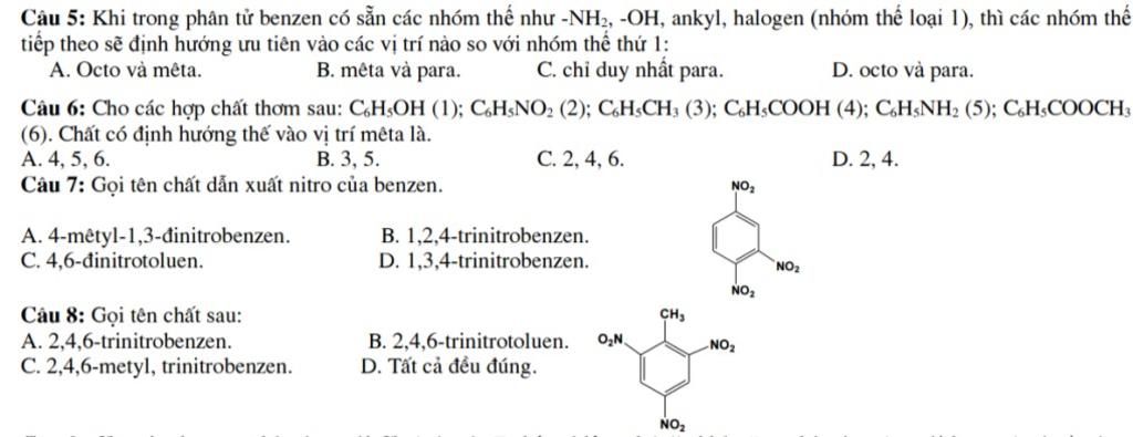 Câu 5: Khi trong phân tử benzen có sẵn các nhóm thế như -NH2, -OH, ankyl, halogen (nhóm thế loại 1), thì các nhóm thế