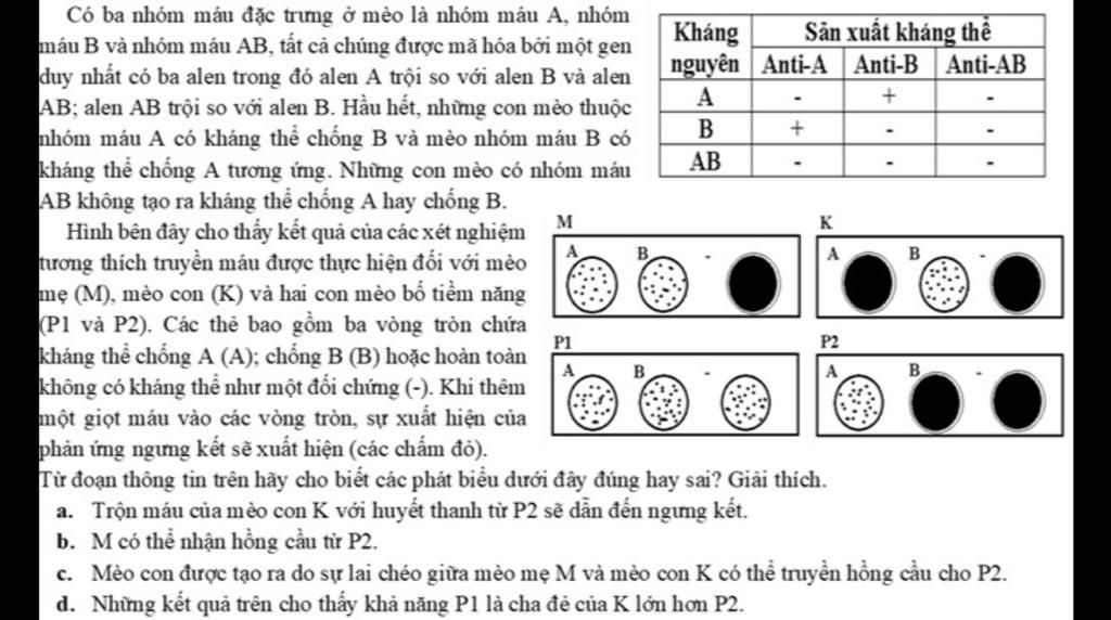 Hình bên đây cho thấy kết quả của các xét nghiệm tương thích truyền máu được thực hiện đối với mèo mẹ (M), mèo con (K) và hai con mèo bố tiềm năng (P1 và P2). Các thẻ bao gồm ba vòng tròn chứa kháng thể chống A (A); chống B (B) hoặc hoàn toàn không có kháng thể như một đối chứng (-). Khi thêm một giọt máu vào các vòng tròn, sự xuất hiện của phản ứng ngưng kết sẽ xuất hiện (các chấm đỏ).