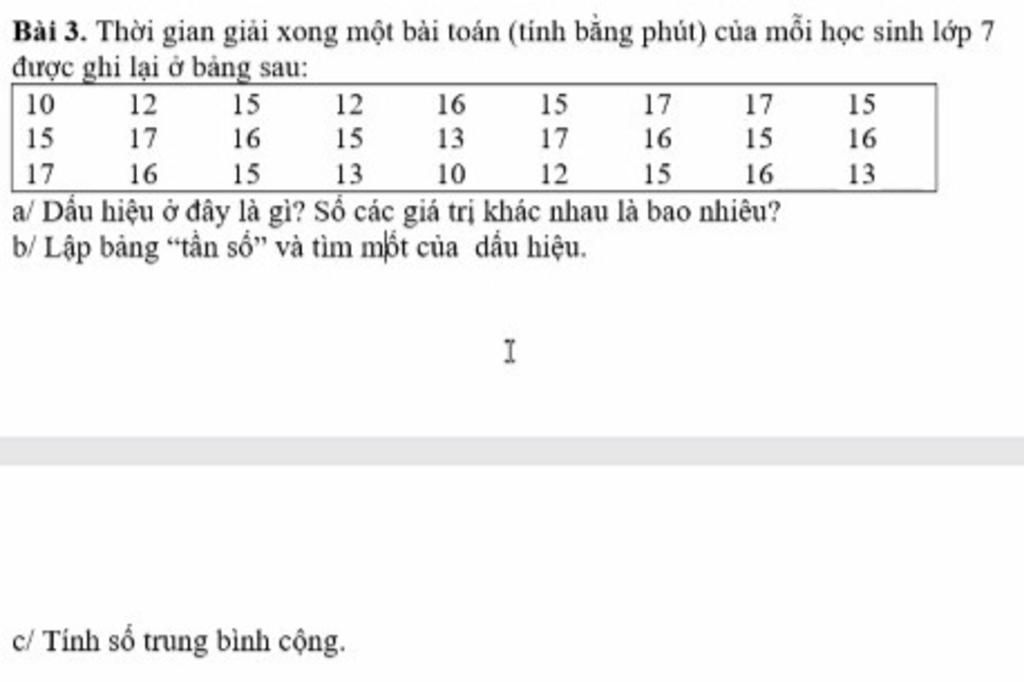 a) Dấu hiệu: thời gian giải xong một bài toán của mỗi học sinh lớp 7