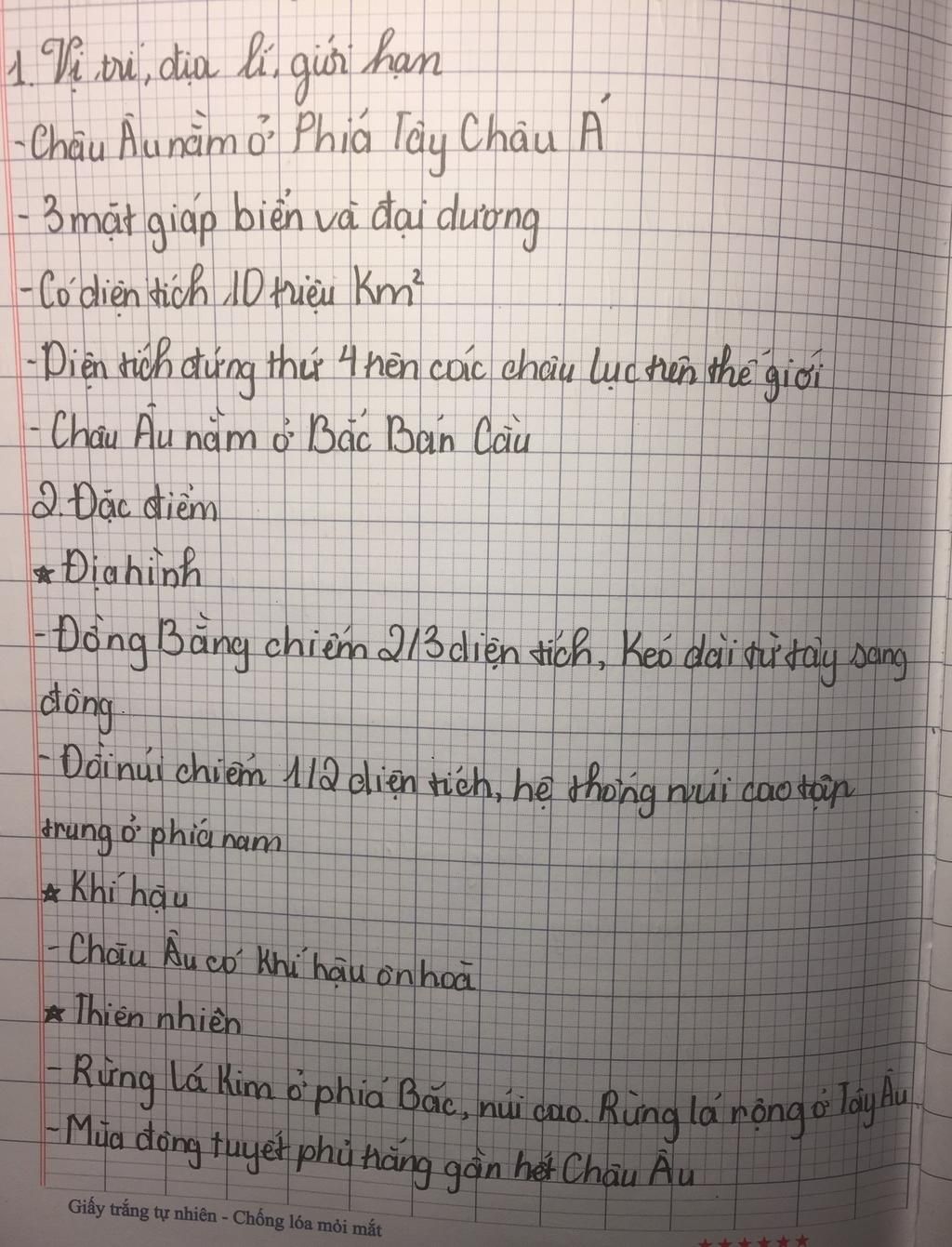 -Tóm lại, Châu Âu là một châu lục nằm ở phía bắc bán cầu, phía tây của Châu Á với 3 mặt giáp biển và bao gồm 44 quốc gia độc lập