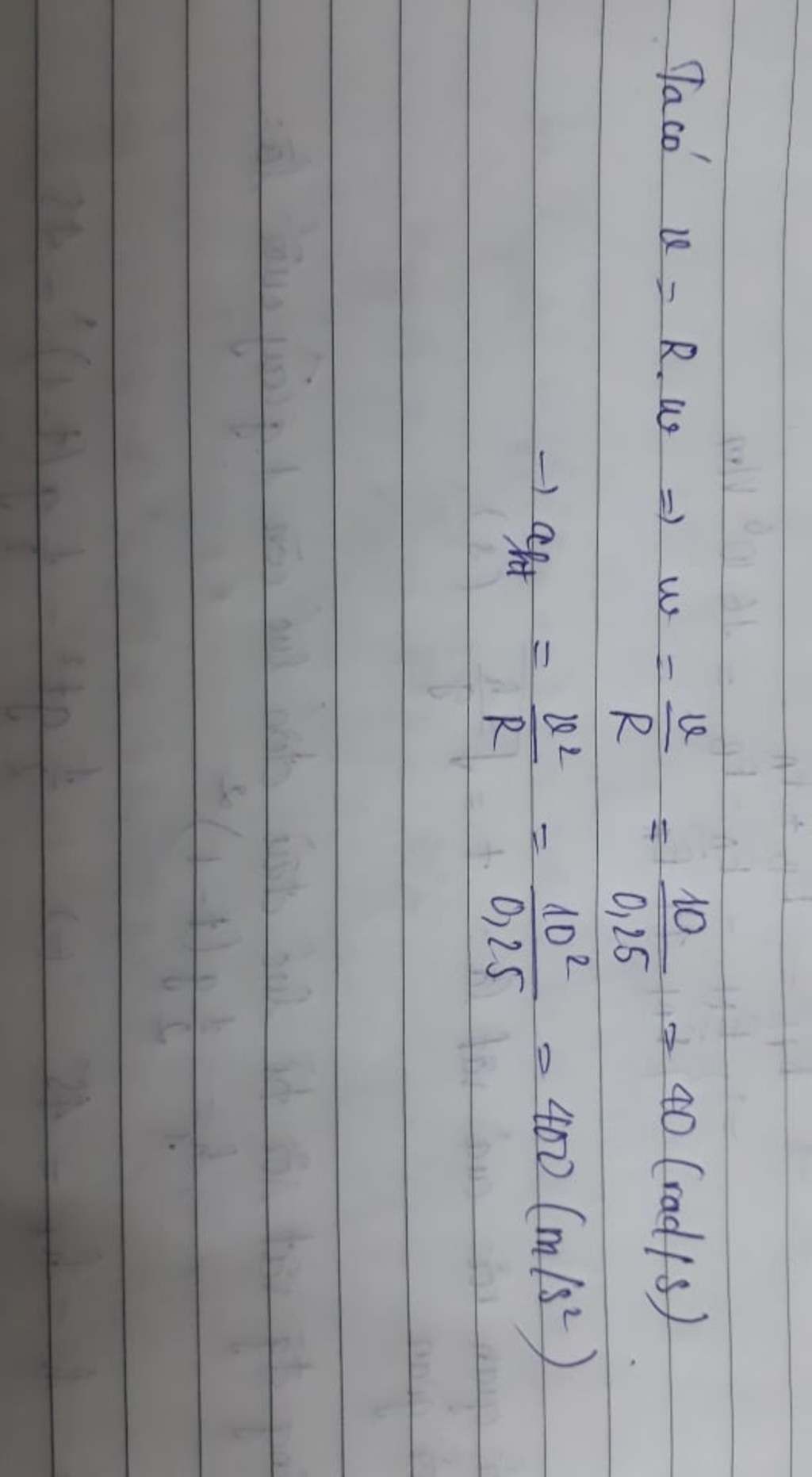 tốc độ góc: v= ω.r<=> ω=v:r= 10:0,25=40(rad/s)