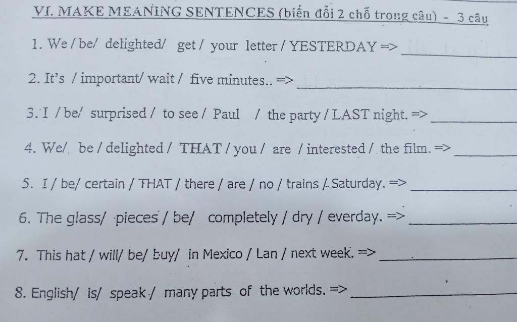 VI. MAKE MEANING SENTENCES (biến đoi 2 chỗ trong câu)