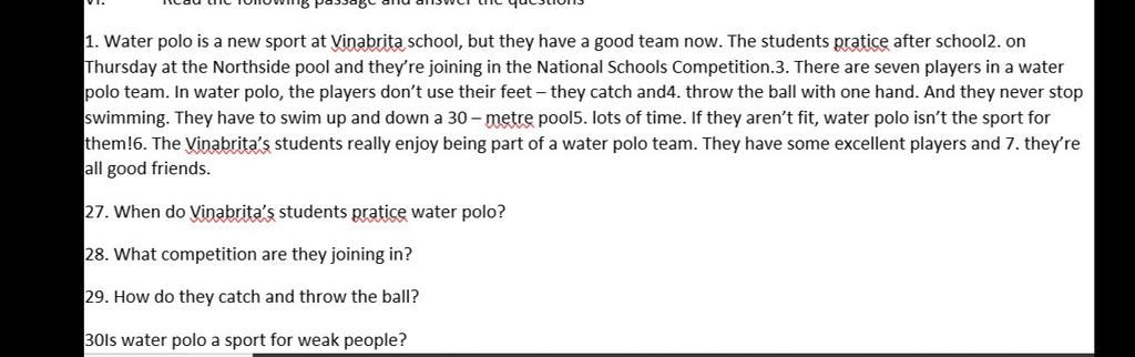 $\Longrightarrow$ Ở dòng thứ 3, từ In water polo, the players don't you their feet....with one hand.