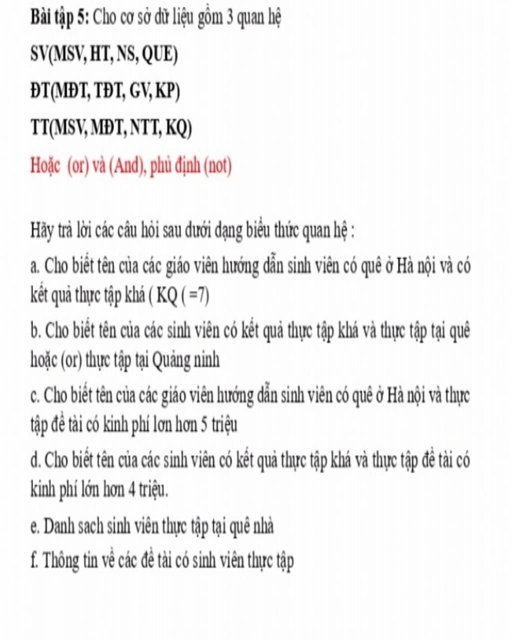 Bài tập 5: Cho cơ sở dữ liệu gồm 3 quan hệ