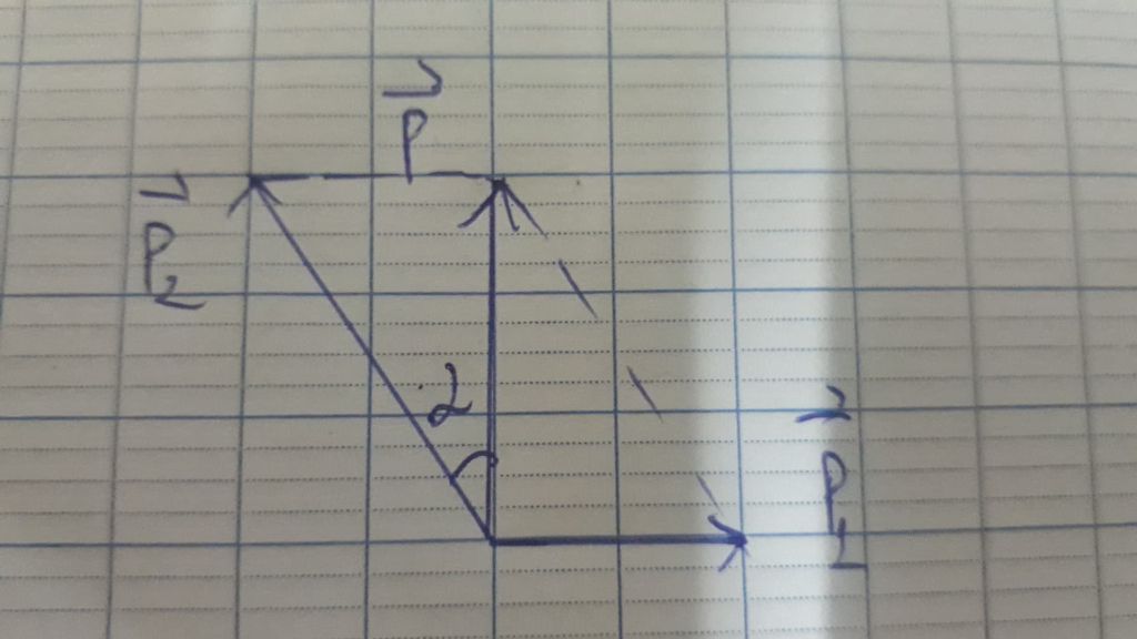 \[\tan \alpha = \frac{{{p_1}}}{p} = \frac{{\frac{m}{2}.{v_1}}}{{mv}} = 1 \Rightarrow \alpha = 45^\circ \]