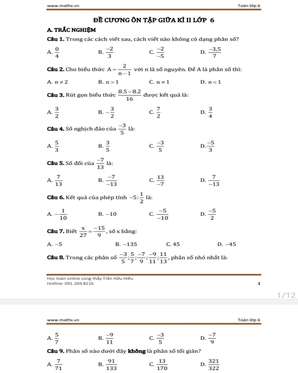 Câu 1. Trong các cách viết sau, cách viết nào không có dạng phân số?