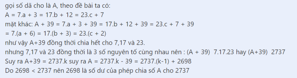 $→$ a chia 7 dư 3, chia cho 17 dư 12, chia cho 23 dư 7.