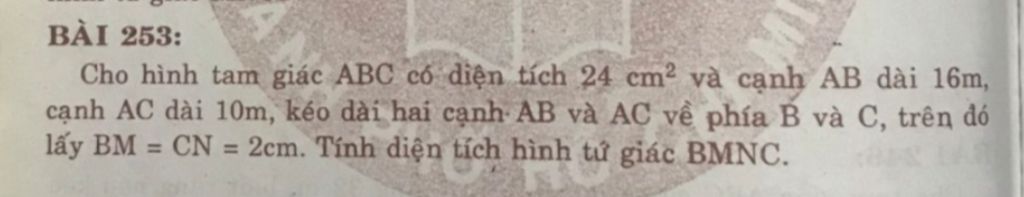 Xét tam giác ABC và tam giác BCM có chung chiều cao hạ từ C xuống AB, $\frac{AB}{BM}=\frac{16}{2}=8$ nến diện tích tam giác ABC gấp 8 lần diện tích tam giác BCM