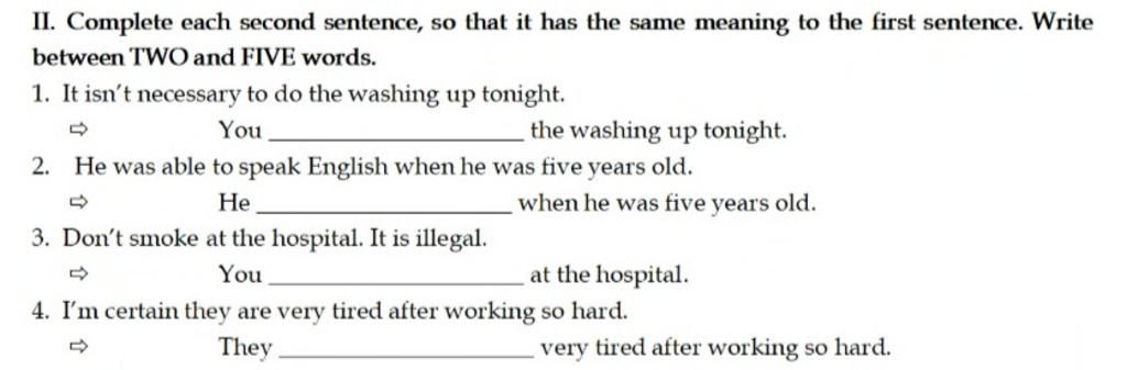- It + to be + not + necessary + (for somebody) + to V $=$ S + needn't + V (Bare) $=$ S + doesn't/ don't have to + V (Bare): Ai đó không cần phải làm gì.