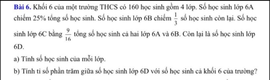 `b)` Tỉ số phần trăm giữa số học sinh lớp `6D` với số học sinh cả khối `6` của trường là: