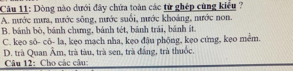 Câu 11: Dòng nào dưới đây chứ toàn các từ ghép cùng kiểu?