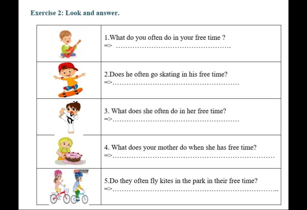 1. What do you often do in free time? (Bạn thường làm gì vào thời gian rảnh rỗi?) =>I often play the guitar Tôi thường chơi đàn guitar